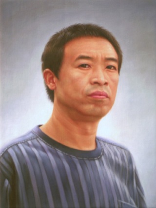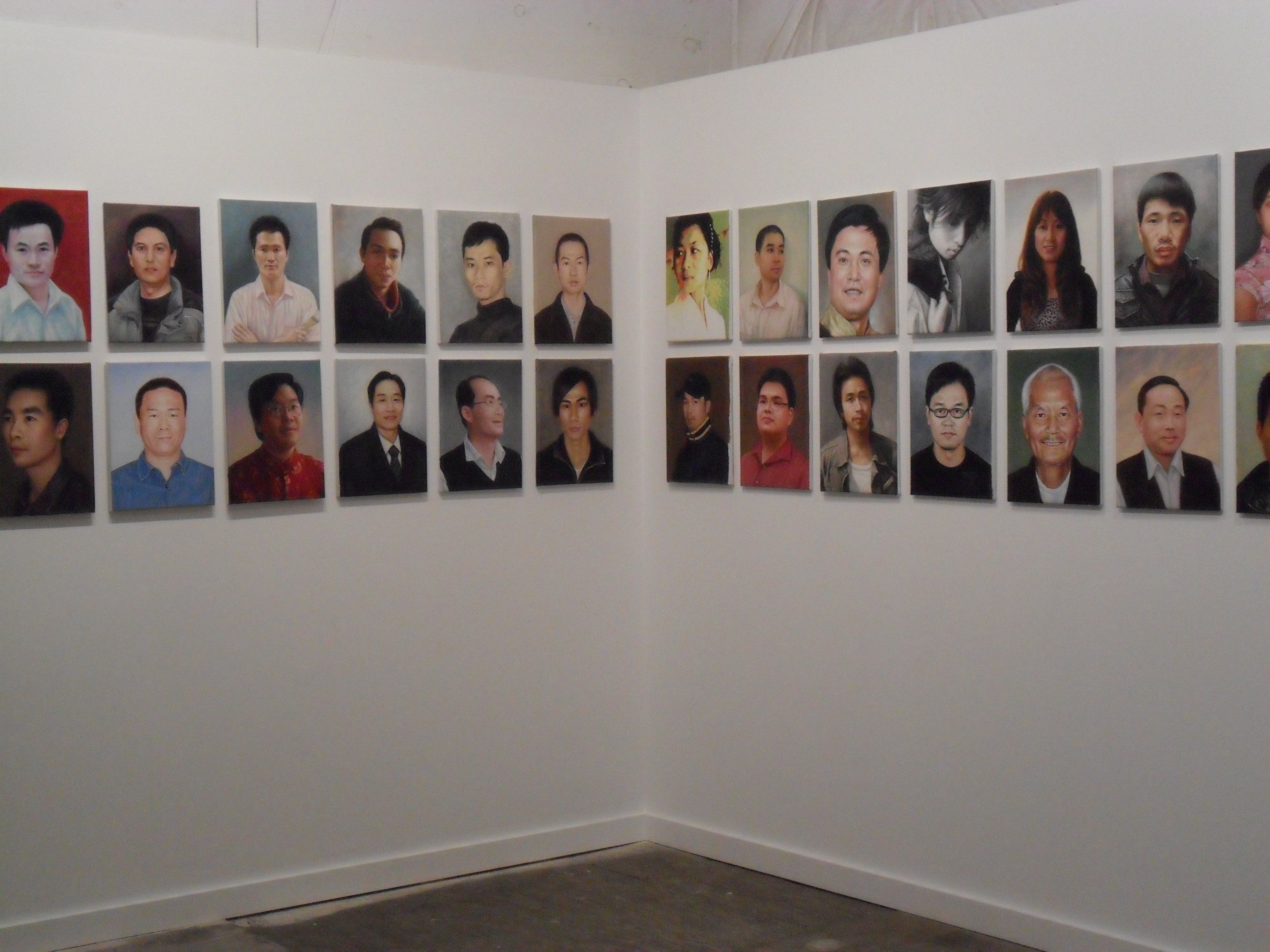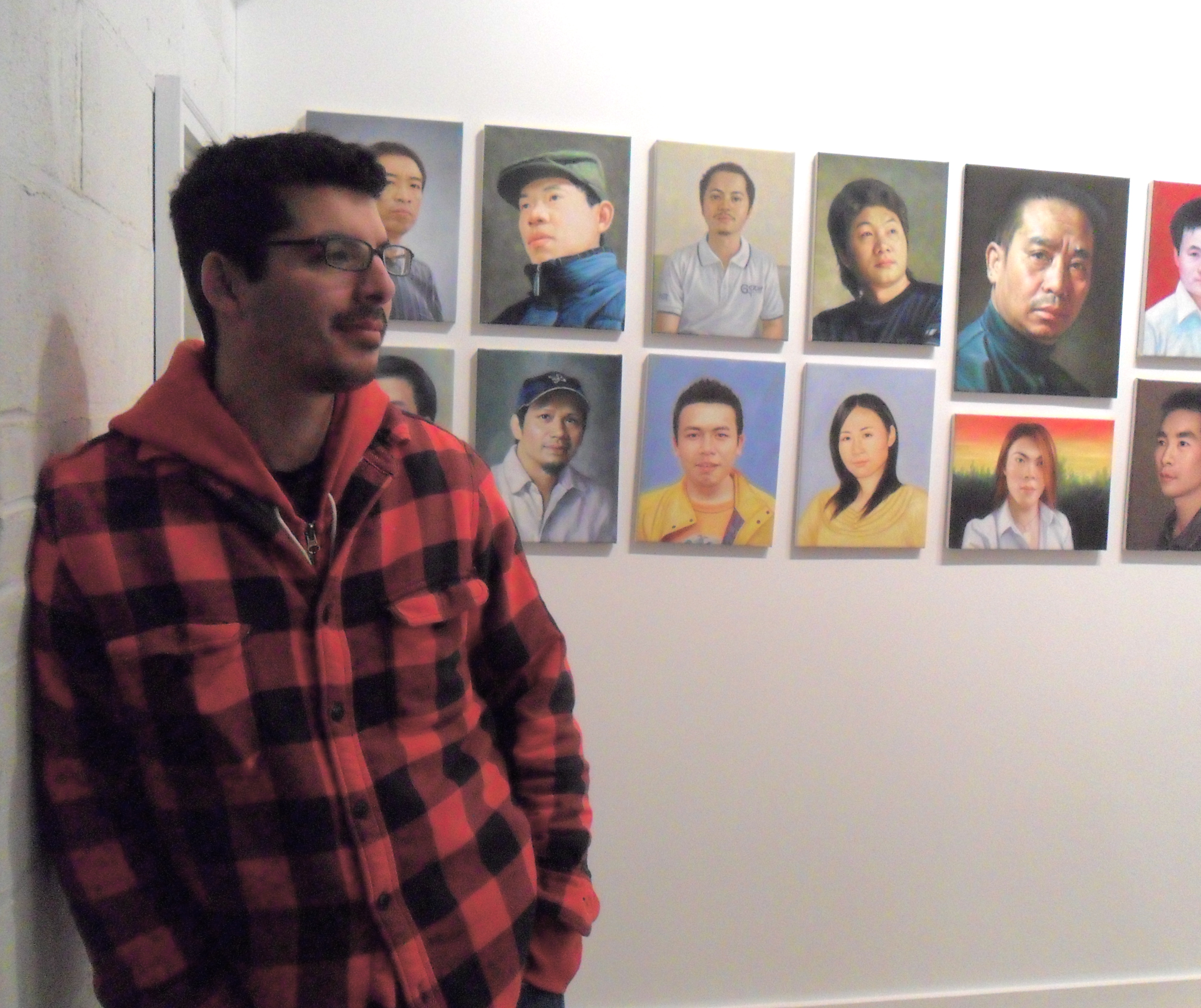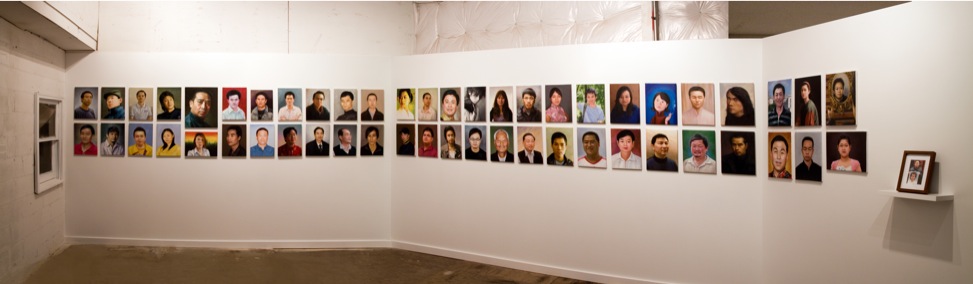 So as someone who is trained as a commercial illustrator, deciding to come into a grad program, I wanted to question a lot of things about industry in art, and my role in those things. So this piece here is 52 oil paintings that are made as a response to my question. I contacted an oil painting company in Dafen–the general manager is named Yu Lin–and I asked him if his workers could make a self-portrait of themselves. So each worker would make one self-portrait of him or herself, and then I could then collect and display them as images of each and every one of the artists that work as part of his studio. So there are 52 paintings, one from the boss, and 51 for the rest of the workers.
