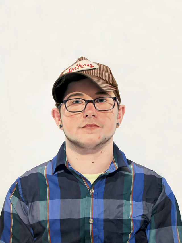 AE: You also have an ongoing series in which you are painting a self-portrait every 6 months to a year, documenting your process of transitioning from female to male. Each of these paintings are the same size and composition, with only your clothing and physical appearance shifting. I feel like for viewers, this is a very generous series of paintings; you are allowing us to really examine, compare, and study some of these physical changes in your body. Does the process of painting these repeated self-portraits allow you to see changes that you might have not previously noticed? Do you have a sense of how long you will continue these paintings? Might we be seeing the process of male-pattern baldness off in the distant future?