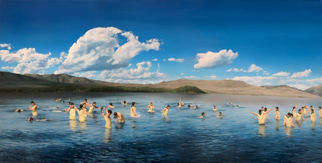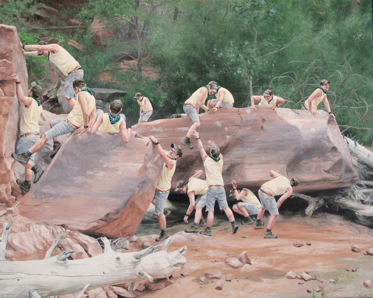 I was on the road going from one location to the next for about 3 months. I had a few stops along the way where I could chill out in a hotel room, upload my photos and start to organize them. But it wasn’t until after I was done with the main stint of traveling and stopped for a longer period that I was able to start working with the images in Photoshop. I would start with hundreds of photos and narrow them down to a few dozen, playing with the different interactions and finding new ones that I hadn’t thought of while in the landscape. I would work on the image off and on for a week or two, until I was happy. I then projected the image to get the best scale and make any alterations to the image before I would build my canvas, re-project to outline the image and begin painting. I spend a pretty good amount of time with gesso and sandpaper to get the smoothest possible surface. I spent about 3 months working on Untitled (Lake McDonald), starting with blocking everything in and slowly bringing out the details with thin and smooth layers of paint. Close to the very end I add a few really tiny people way in back. Depending on the stage and size of the painting I will sometimes work on a few paintings at a time.