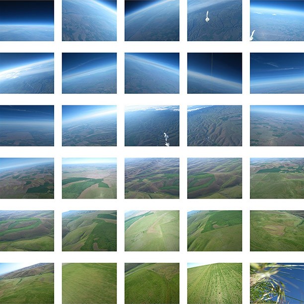 GF: I know Chris Thompson from high school (Portland, OR). A few years ago, he and Justin Hamel began the balloon launches as a hobbyist-engineering endeavor to see if they could successfully launch and retrieve a high altitude balloon. Via social media, I saw some of the images from an early flight and immediately wrote to Chris, proposing collaboration. They were more interested in the science/physics side of the project and of the possible heights achieved (as documented visually by the camera), where I was interested in what the images revealed about the complete lack of human control, the processes of flight and unpredictable occurrences: wind patterns, atmospheric conditions, gravitational pull and the limits of automated photography. Through the partnership, I was able to reframe some elements of the flights that they saw as disappointments (for example, condensation on the lens that obscured the imagery of the first flight), and via my pieces, they found new appreciations for what they had written off as flawed.