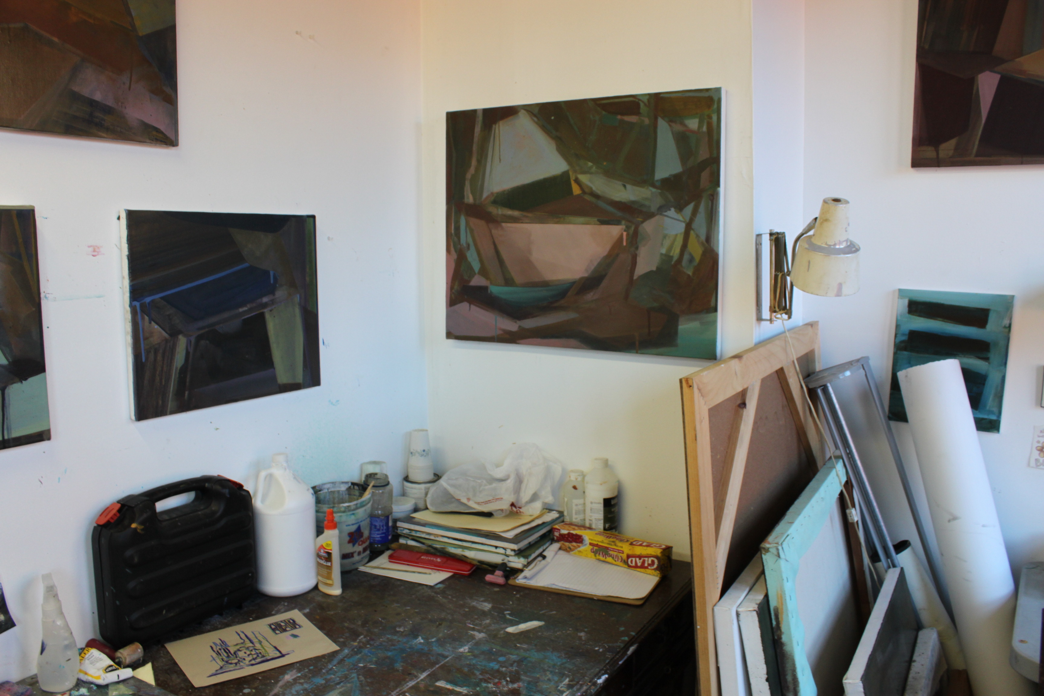 AE: Have you always worked in abstraction? You seem to really solidly work within the true definition of abstraction–in that you are abstracting from something (whether a place, image, or memory), rather than making truly non-objective work. How do you gauge what level of abstraction you work with? There are some elements that seem to really tie to a sense of the landscape, whether in the color of the sky and earth, or in an abstracted structure based on rock formations and the like. And yet, the paintings are not entirely “readable” in terms of representation. How much do you want to show us (or tell us), as your viewers?