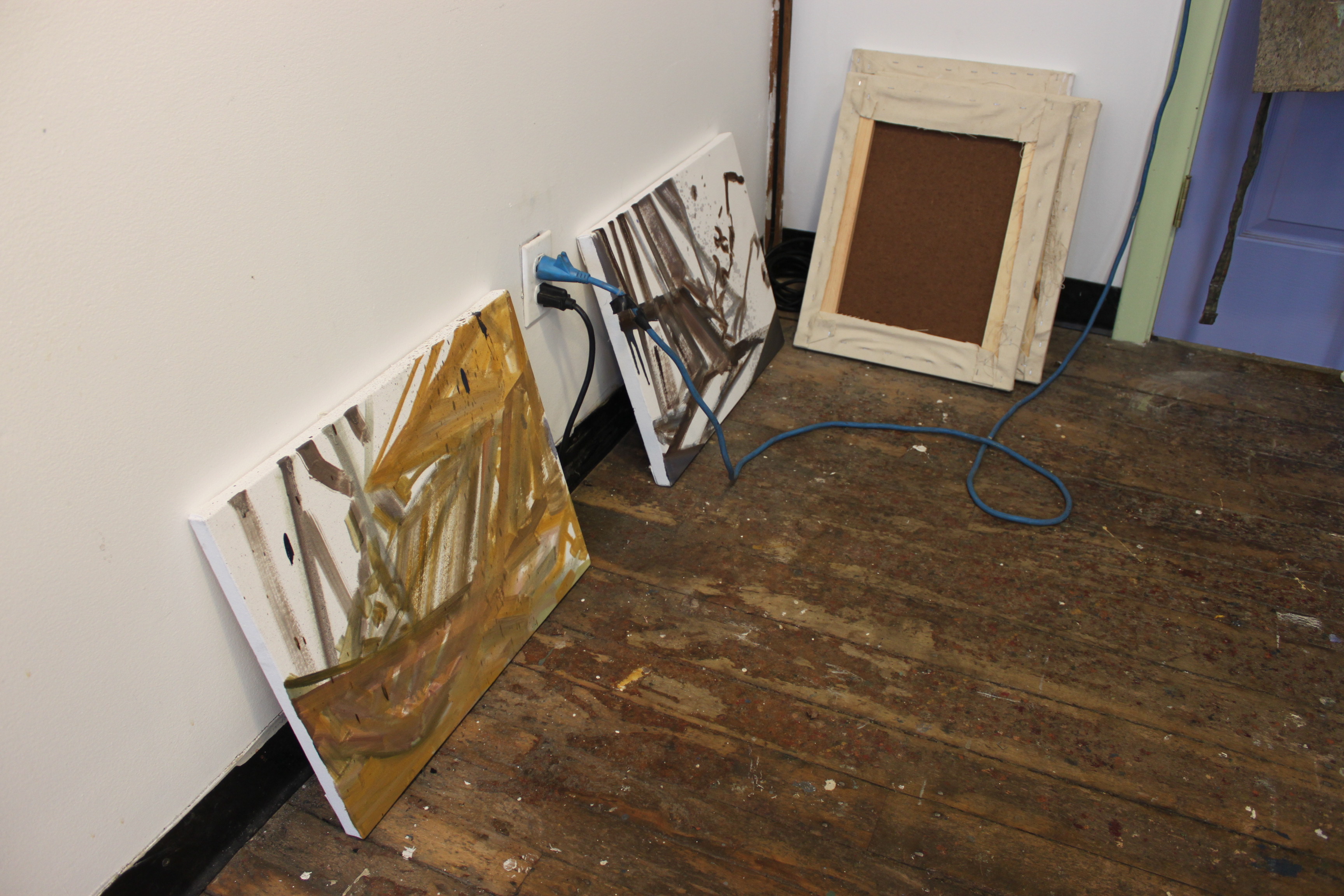 The grounds themselves are handmade panels with canvas stretched over them. I use a rag to wipe away paint a lot and the pressure of doing this to a surface for weeks and weeks caused the canvas to sag (no matter how tight it was originally stretched.) With the panel underneath I get the support I need to be physical with my work, but still have the beautiful texture of the canvas to expose if I choose to.