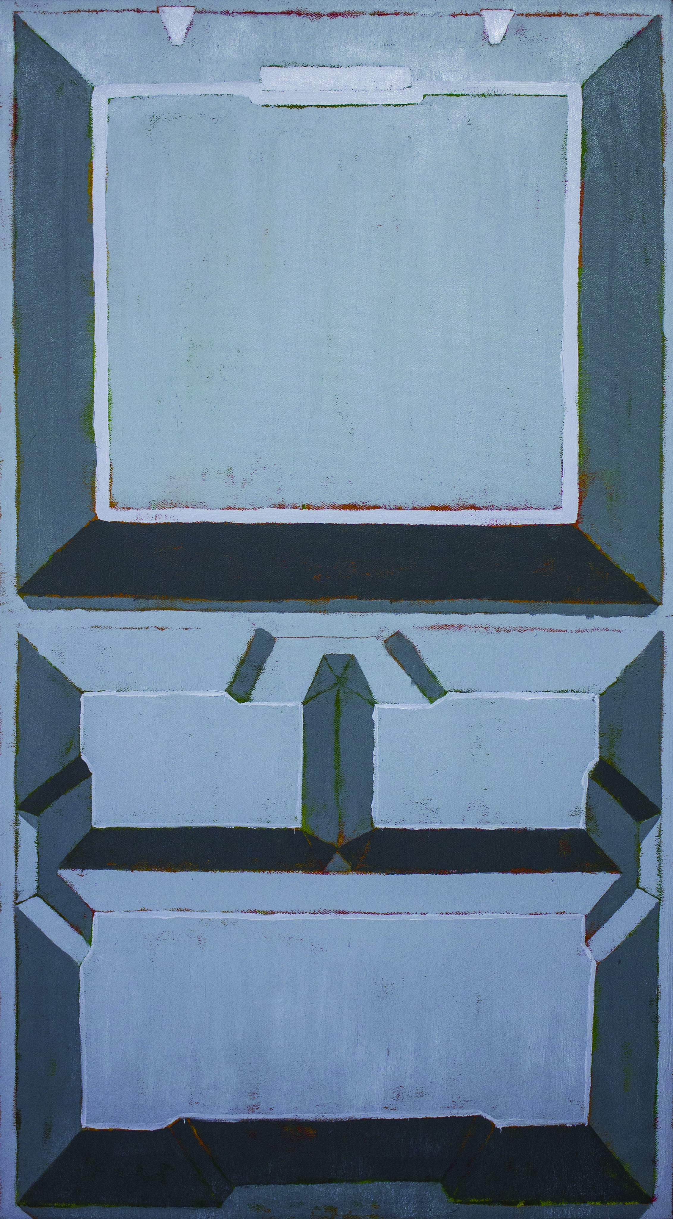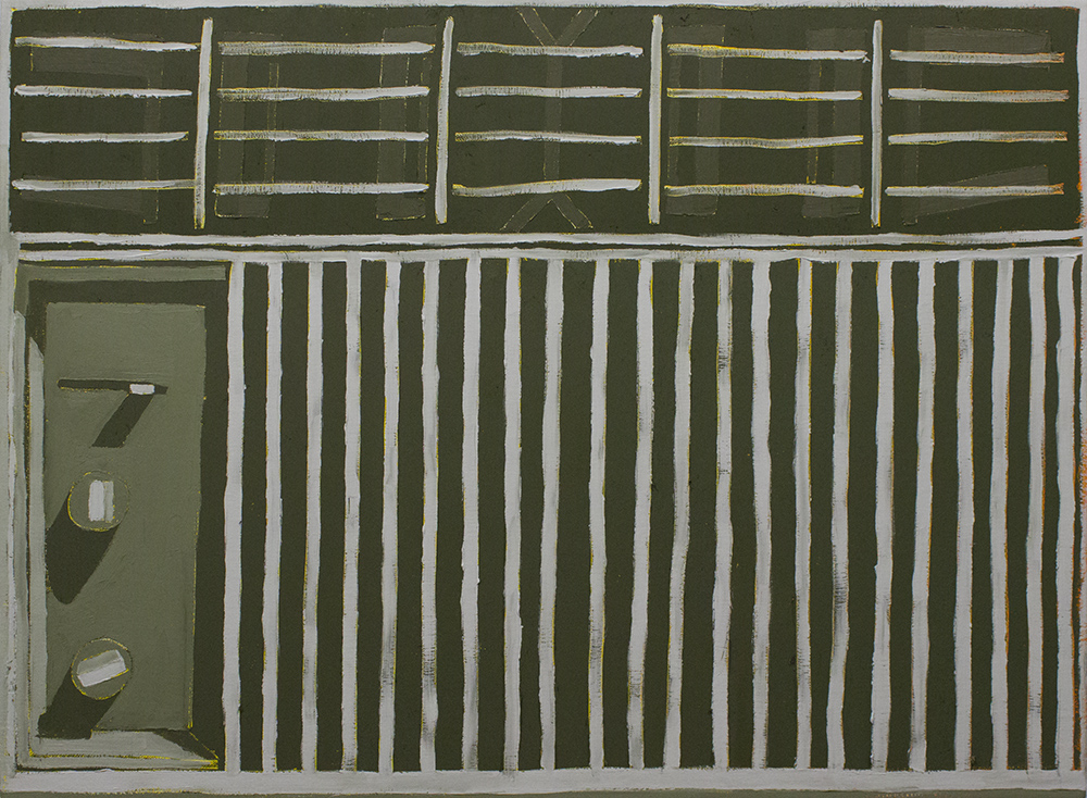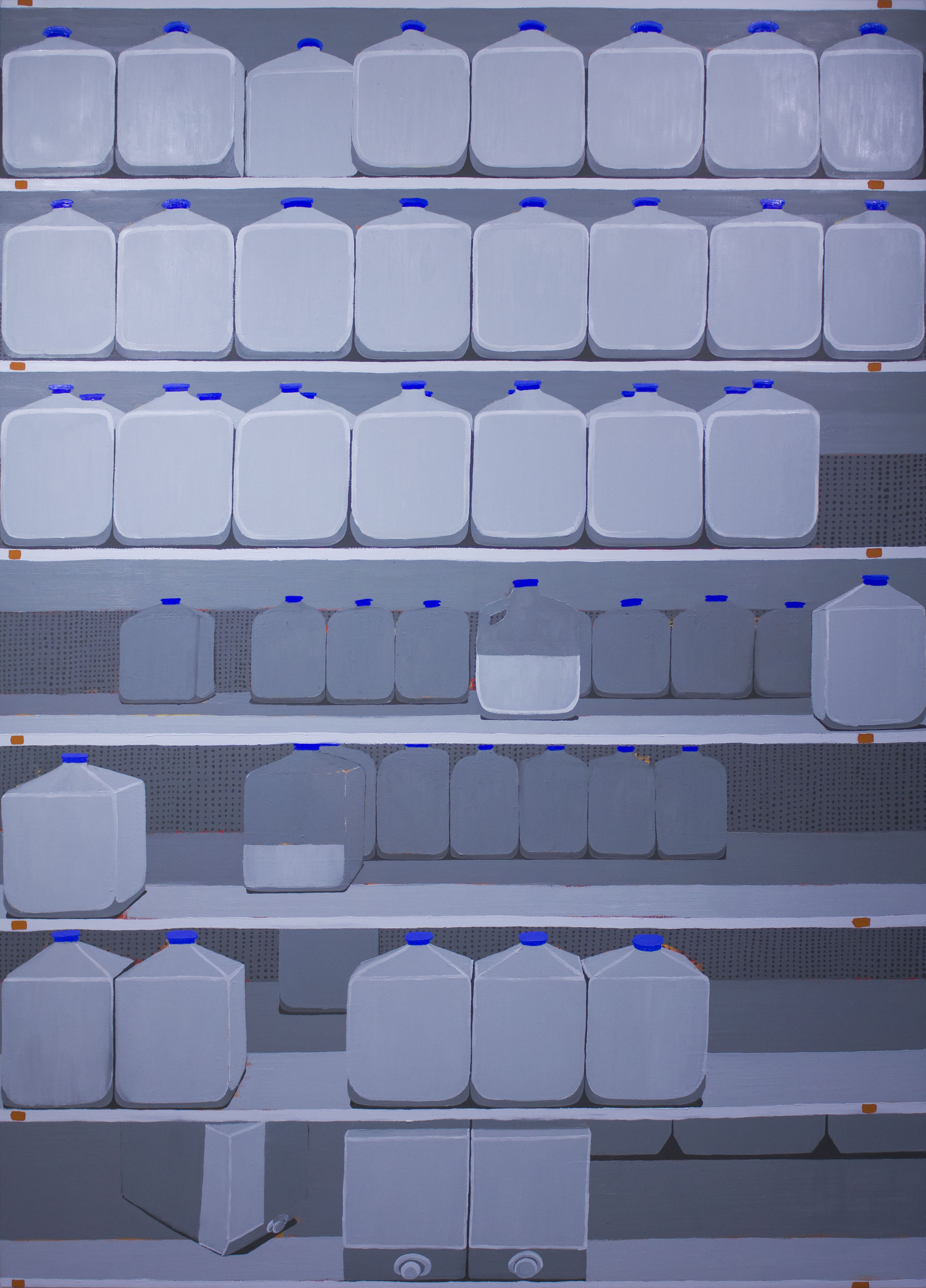 AE: I was excited to see a couple of your new huge paintings in your studio during our visit: the grey-scale motel room painting and the grocery store shelves stacked with gallons of water. I know these pieces were largely influenced by a recent job you had that involved driving around different parts of the Northeast. In many of your other pieces, it seems that you work a primarily from objects and spaces you interact with on a daily basis; in these new paintings, you are working from things and spaces that you came into contact while on the road, things that are perhaps a little more foreign to you. In the paintings of your sink or shower, there is the process of looking carefully and intently at something common, something you know well. When we travel, we often see things for the first time, and they appear new, unique, and particular. Do these newer paintings feel different to you, as you are in the process of planning and creating them? Is their content different than the other work? Or is the process of seeing and translating into paint the same across all subject matter?