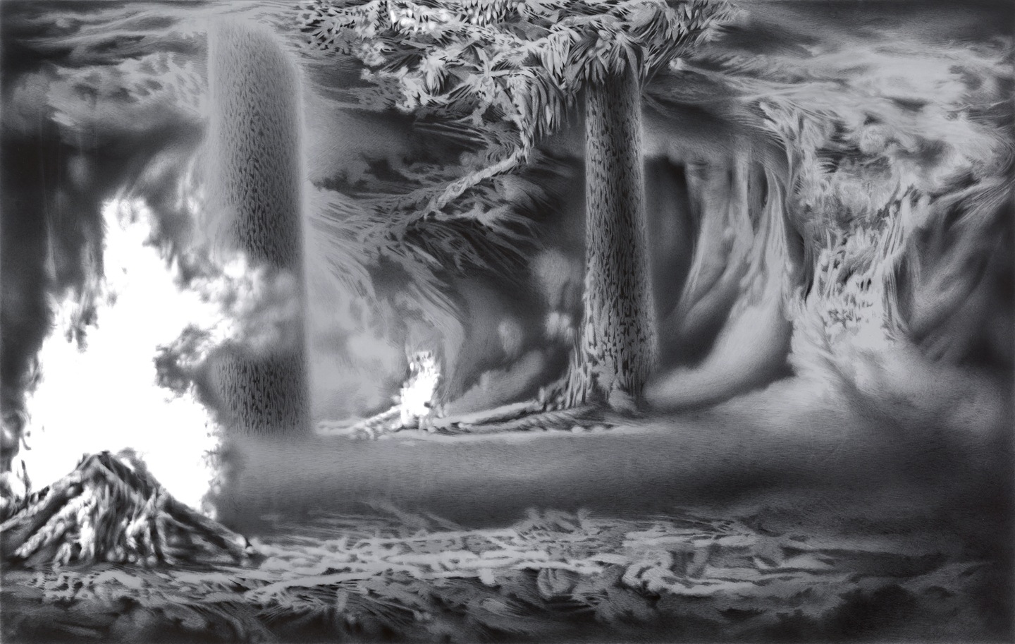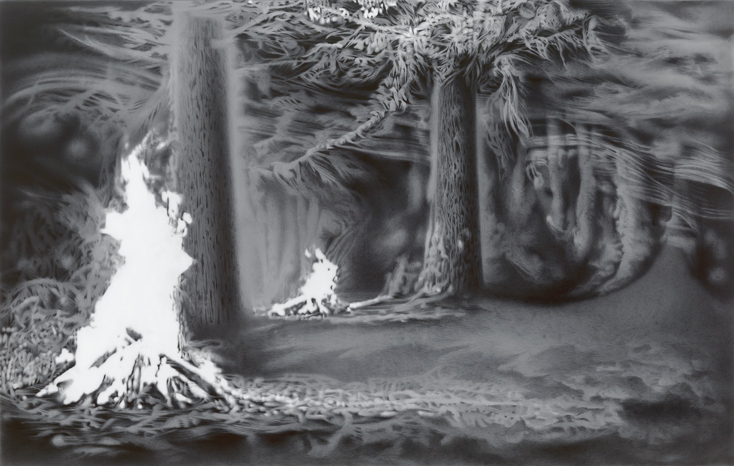 My work examines the inadequacy of the senses in deciphering direct experience. Fire in Woods I-IV are inspired by a scene in Akira Kurosawa’s 1954 film, Seven Samurai. The drawings depict the eve of battle, when the underdogs await enemy invasion in a landscape that mirrors their uncertainty.