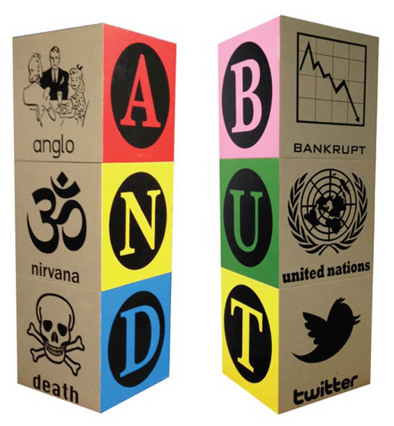 I began creating text-based work after I completed my Masters program in Art Therapy, in which I had heavy training in cognitive therapies. Instead of moving forward with the work as a therapist, I became incredibly inspired by all the research and brought it fully into my studio practice. I’m interested in how humans put together bits of information, especially when word and image are combined, and I’m terribly fascinated by the assimilation of visual information into personal identity, emotion and ethos. But I take this approach into a more personal dimension – I feel that a number of my works become more like over-arching narrative fragments, because of the nature of the content I use. The running themes of what drives humanity forward, our search to make meaning and to find truth, and the different types of recycled archetypal moments that we embody often become the focus of my work.