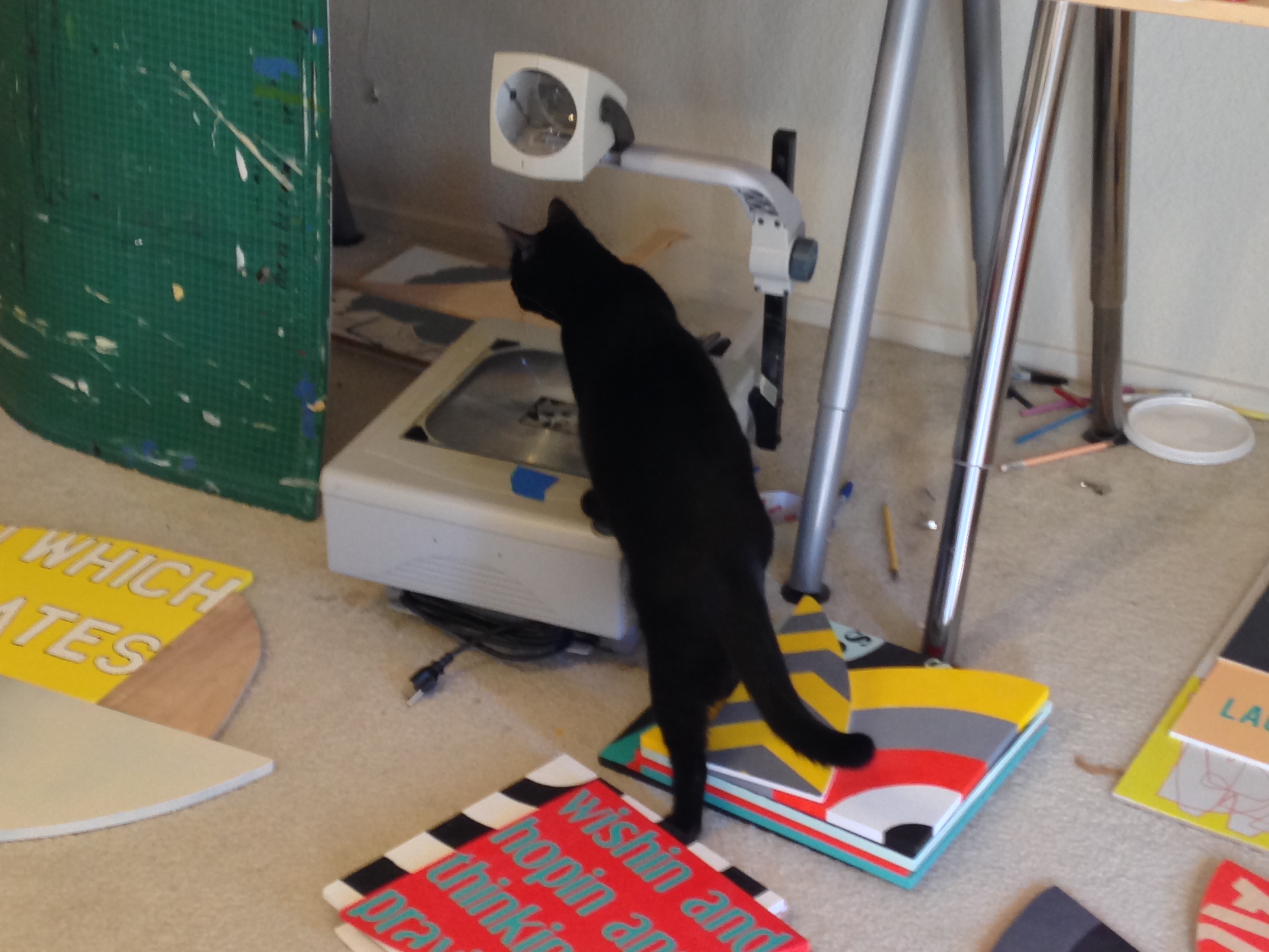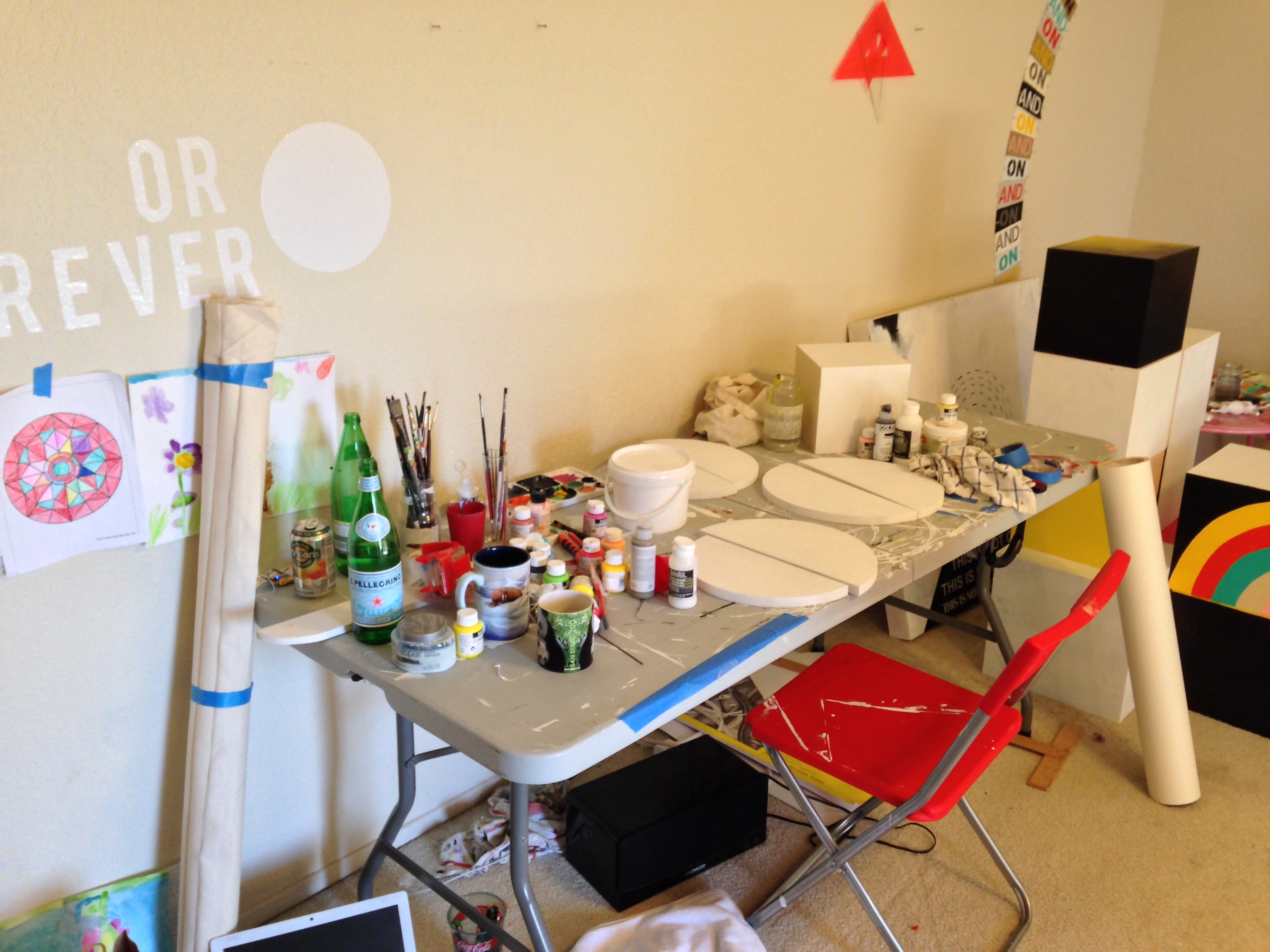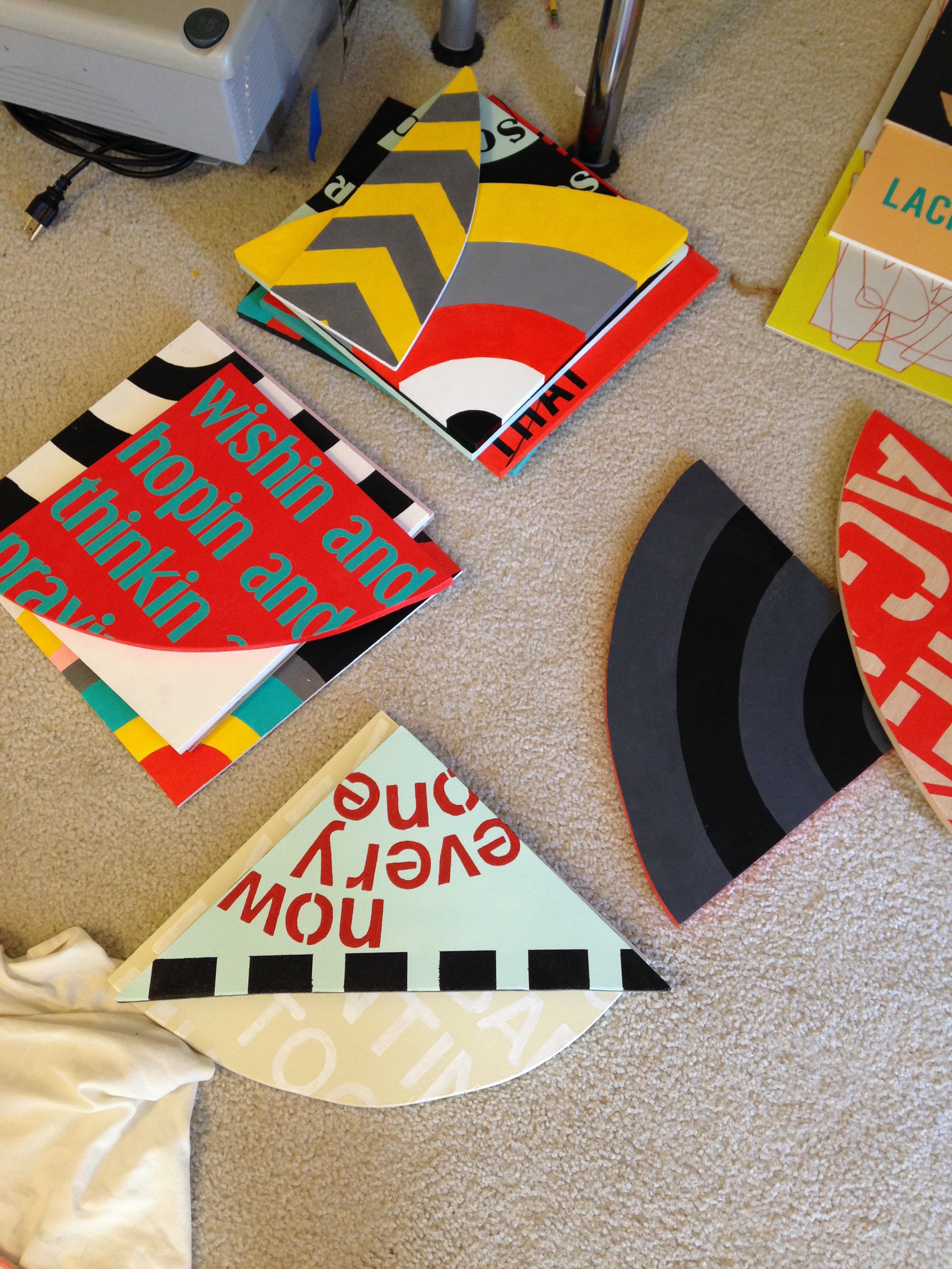 AE: One of the things I loved from the first moment I stepped into your studio, and I remember this even from back when we were at ASU together, is how you work and how you use the space. You likened yourself to a “squatter” in your studio spaces; you just take advantage of whatever space you have. A lot of times you work flat on the ground, you have tables that you work at, even a little porch off your studio where you can use spray paint. Right now, your studio is at home. How do you like working there, versus working in a separate space away from home? Do you feel like you are more productive? What’s a day in the studio like for you?