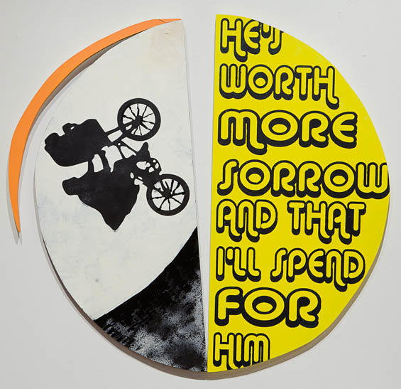 AE: Much of your work is comprised of fragments of images, text, color, pattern, shapes, and they come together like pieces of a puzzle. However, they rarely match up exactly. As a viewer, I’m really aware of the breaks between the pieces, the points where the text or image is cut off, where I’m left hanging, so to speak. Where do the different references for your pieces come from? Some are more visible than others: looking across your work, one can see everything from religious icons and images from art history, to song lyrics and the infamous scene from the film E.T. How do you determine the groupings of different fragments; do you have a clear idea in mind when you begin, or is it more of an intuitive process?