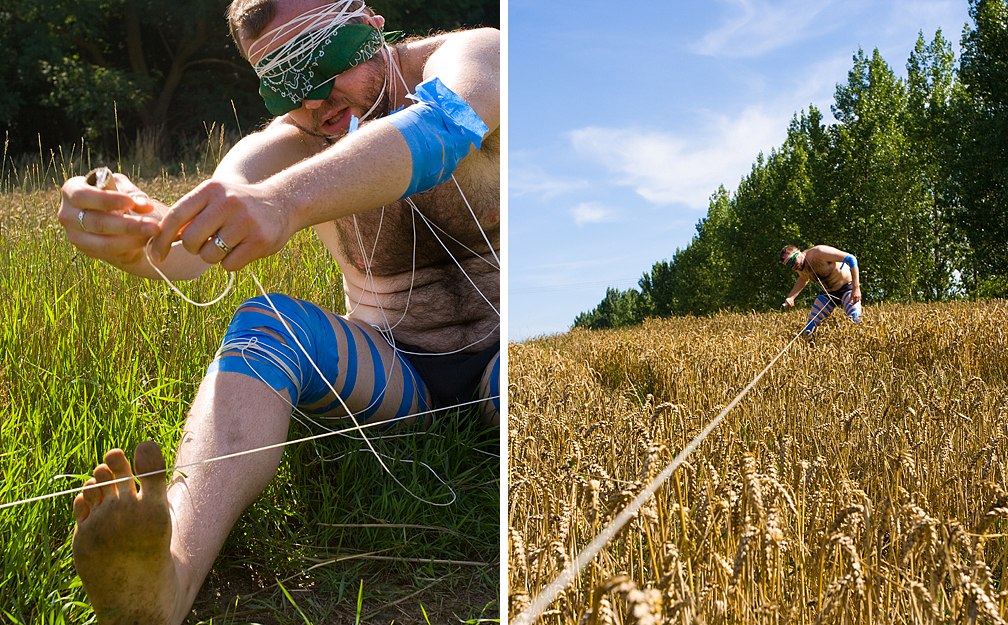 Sean M. Johnson, 3-hour mediation piece with string, blindfold, and painters tape, at IPAH Berlin, Germany, 2008.