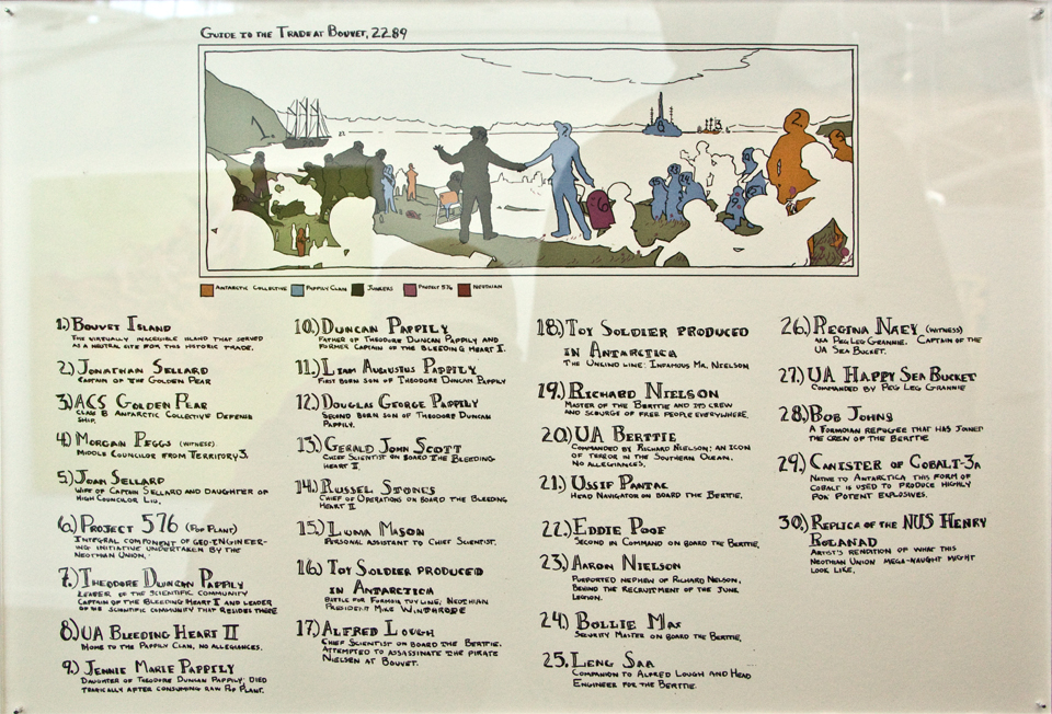 Installation view of Eric Petitti’s A drawing after the famous painting by Winifred Chin, “The Trade at Bouvet Island, 2535 ce“, 2011.