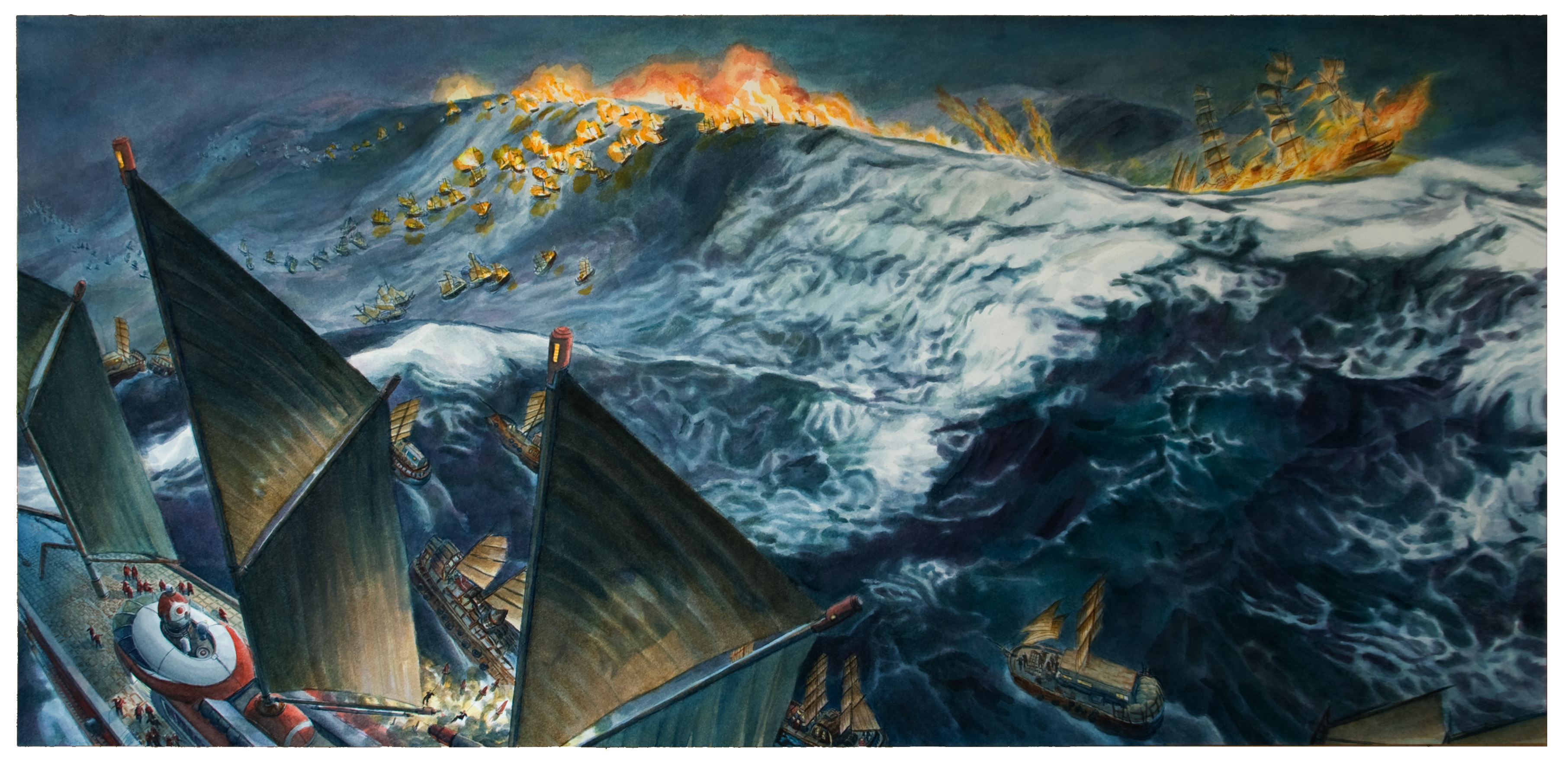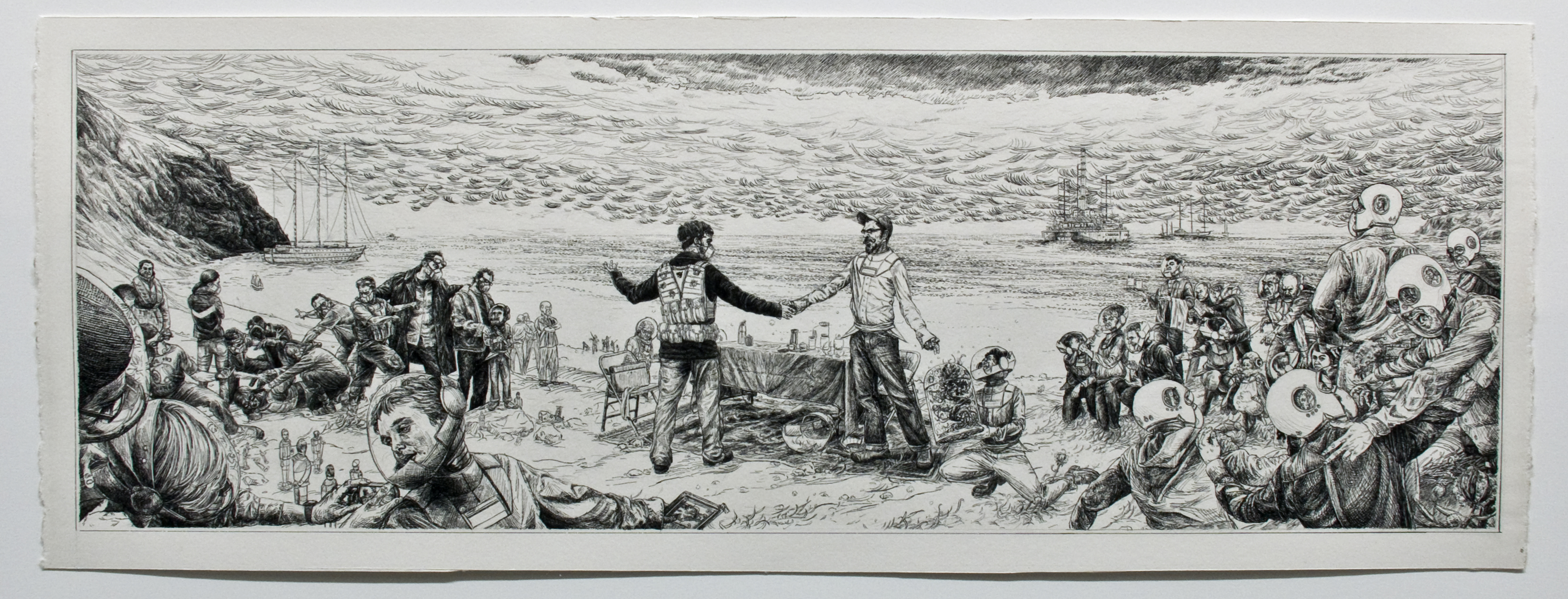 Eric Petitti, A drawing after the famous painting by Winifred Chin, “The Trade at Bouvet Island, 2535 ce”, ink and graphite on paper, 11″ x 30″, 2011.