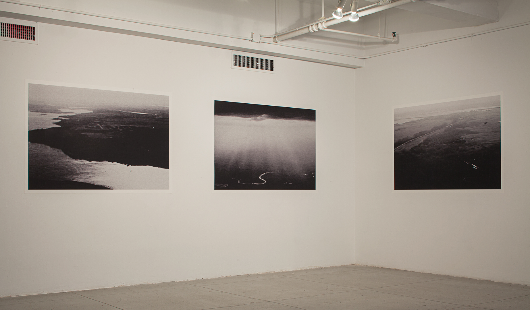 Scott Patrick Wiener, Installation view from Distant Images, Local Positions at the Elizabeth Foundation for the Arts. Left to Right: Untitled 3 (Spies in the Sky), Untitled 2 (Spies in the Sky), Untitled 1 (Spies in the Sky), Archival Inkjet Prints, each image: 40″ x 60″, 2013.