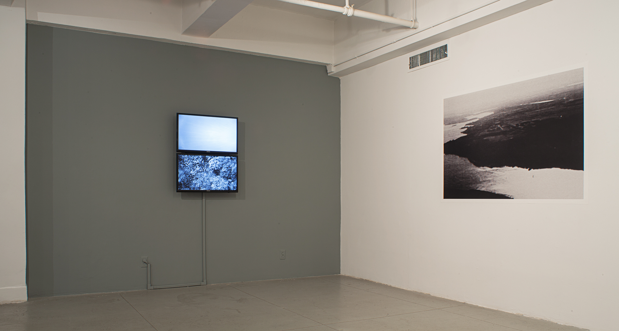 Scott Patrick Wiener, Installation view from Distant Images, Local Positions at the Elizabeth Foundation for the Arts. Left: 3 Surveys, HD Video, Two 40″ LCD Monitors, 11’38” Loop, 2012. Right: Untitled 3 (Spies in the Sky), Archival Inkjet Print, 40″ x 60″, 2013.