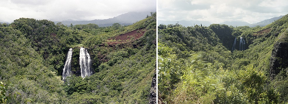 Scott Patrick Wiener, Two Waterfalls (And I’ve Only Lived a Couple of My Dad’s Lives) A. Hawaii (circa 1998 – His Waterfall), B. Hawaii (circa 1998 – My Waterfall), Archival Pigment Prints, 32″ x 86″ (framed), 2012-13.