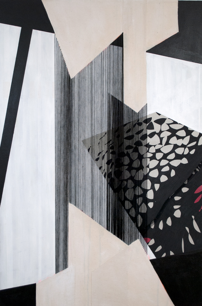 Those observations got me thinking about what I was ultimately trying to do in my work, and I began to have fun with subverting perspectival space by having what you call various “projection systems” in one painting, or having a three-dimensional element actually enter into space. Most often I do this through my use of thread, which I see as just another drawing tool, but one that can come off the surface of the painting and engage with “real” space.